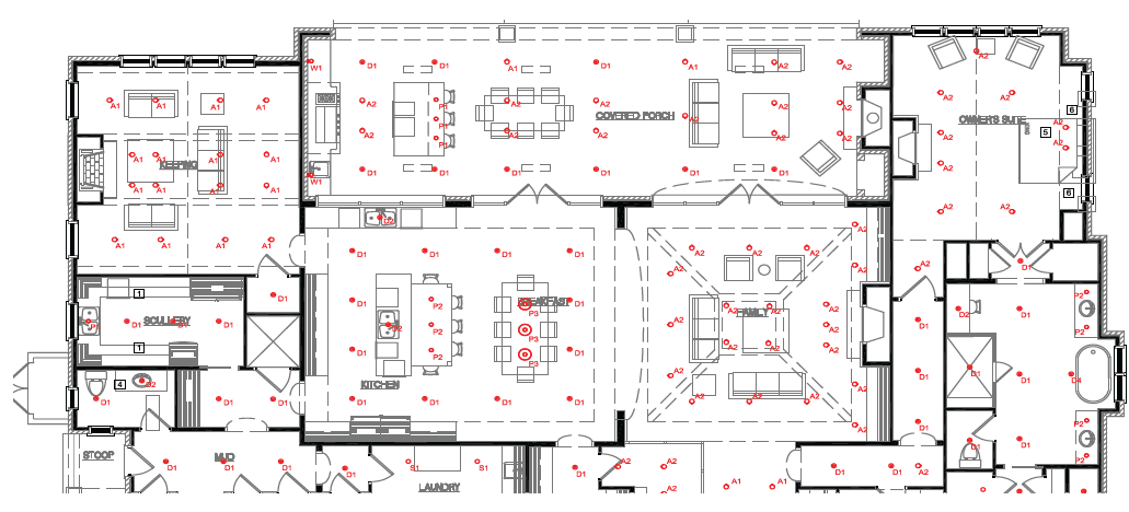 We take the existing lighting design from your master electrical plan and review it. We will recommend location adjustments, fixture types, and beam spreads, and trims. If you are stuck with existing locations that cannot be moved, we can omit location adjustments and stick to fixture type, beam spread, and trim recommendations.